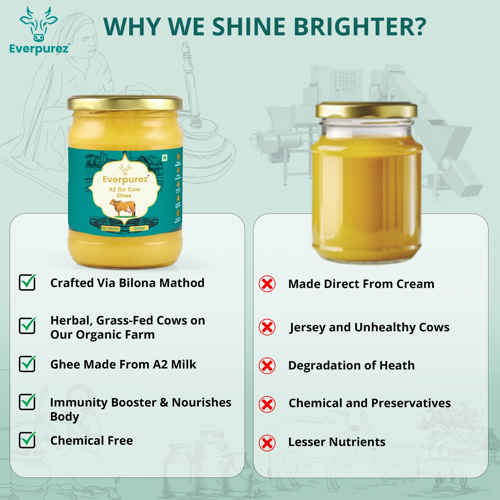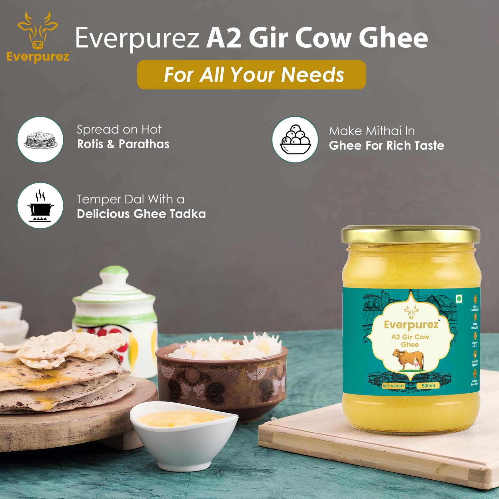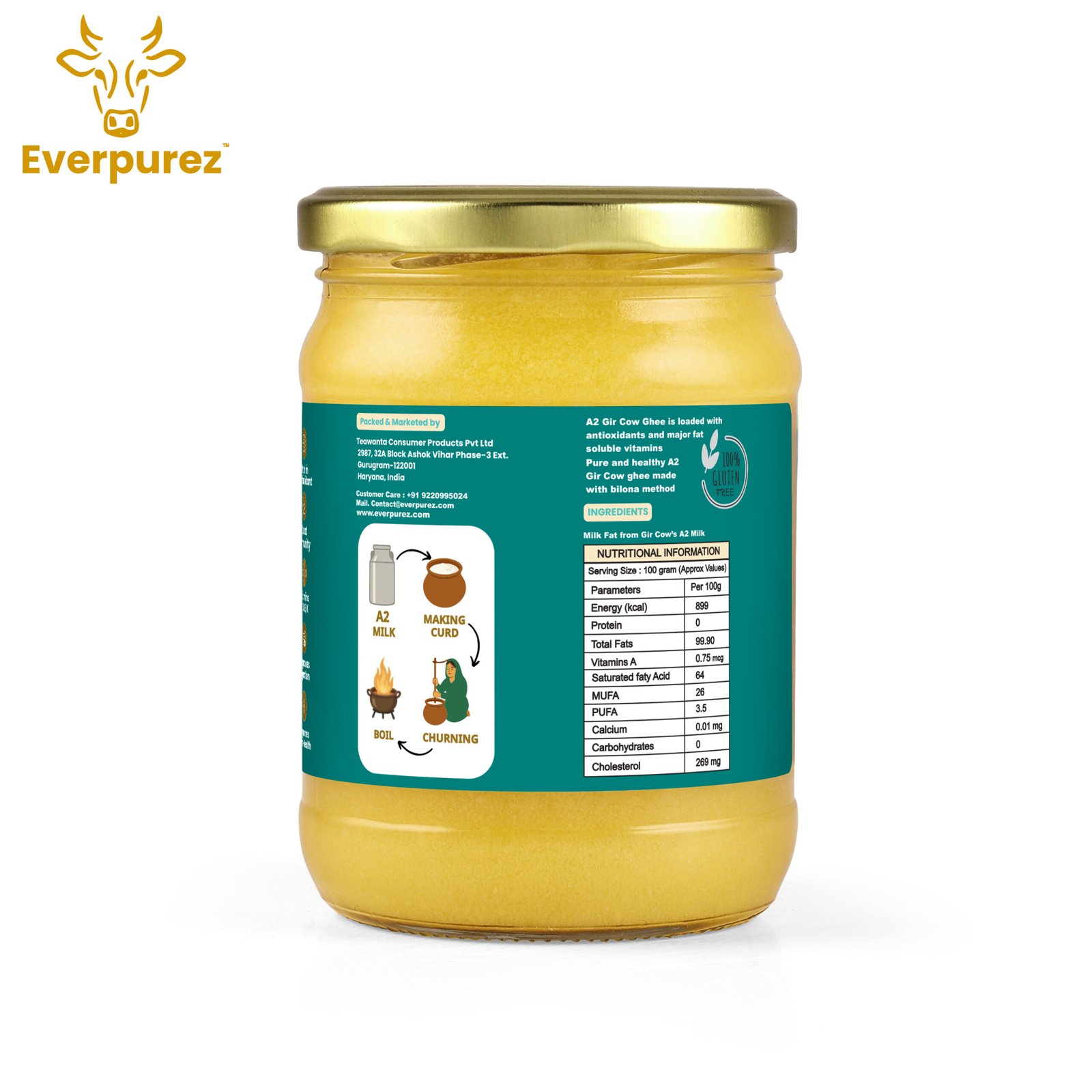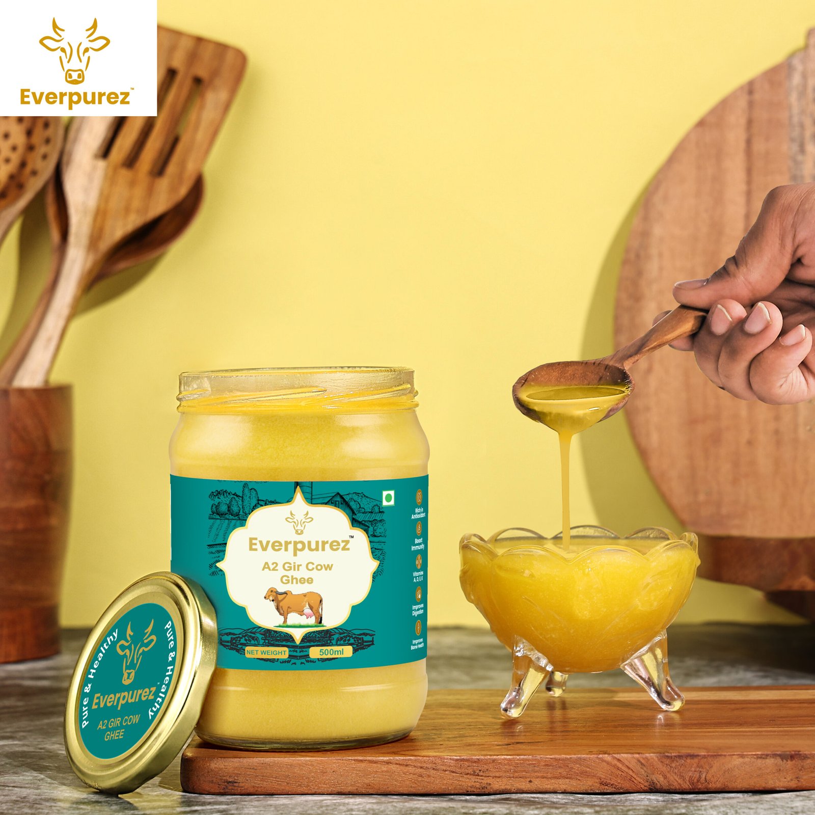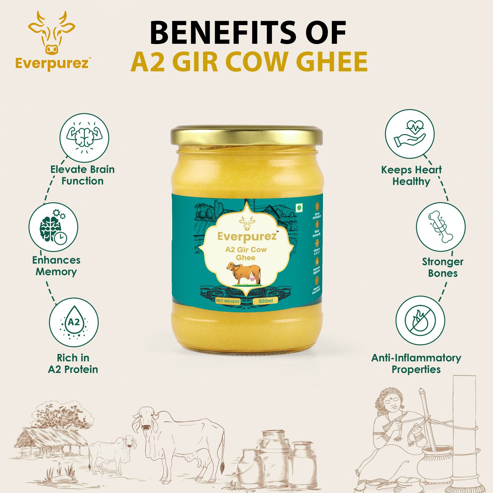 Everpurez’s A2 Gir Cow Ghee is made from the fresh milk of indigenous Gir cows, known for their highly nutritious A2 protein-rich milk. Prepared through the traditional Bilona method, the ghee is slowly hand-churned to preserve its natural aroma, golden texture, and medicinal properties.